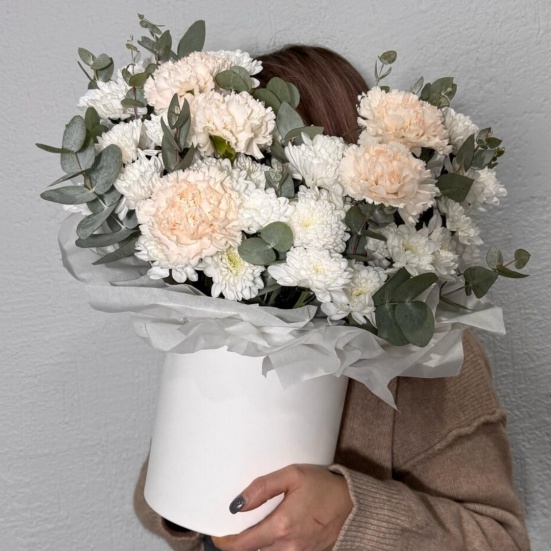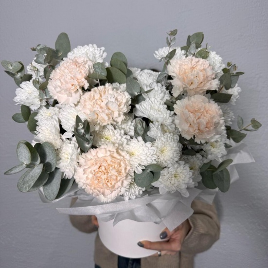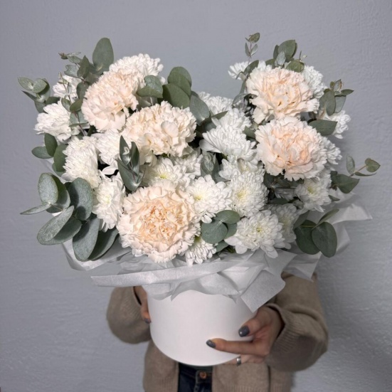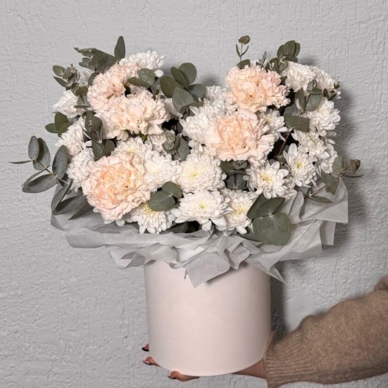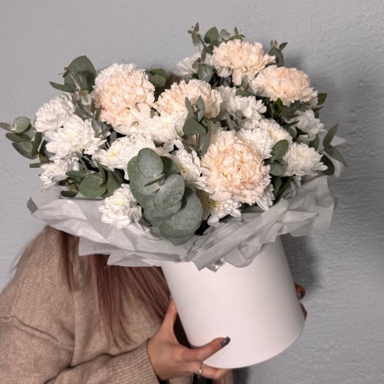 Коробка из кустовых хризантем и диантуса в Анжеро-Судженске